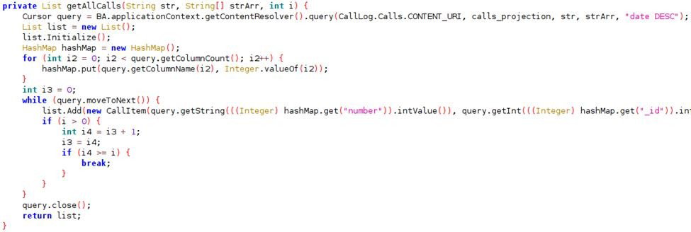 Figure 1: Code snippet from analysis of the function that fetches the call log