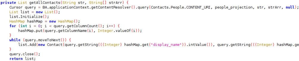 Figure 2: Code snippet from analysis of the function that reads device contacts