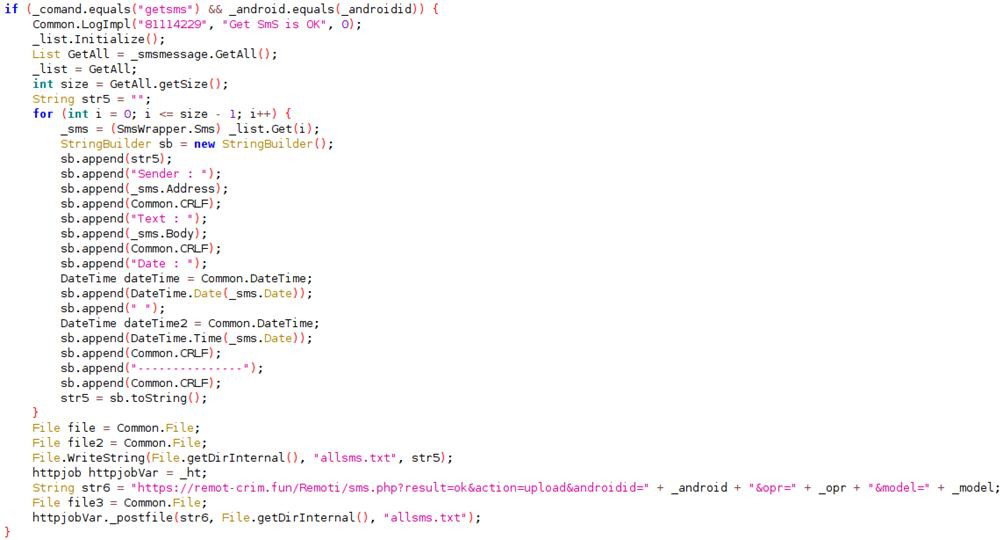 Reading SMS messages not only jeopardizesprivacy but also poses a threat to authentication systems, especially those reliant on SMS for two-factor authentication, such as Google’s implementation.This malware not only reads SMS messages but also possesses the capability tosend SMS messages from infected clients, a sinister feature employed fordisseminating phishing messages.