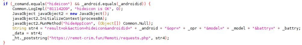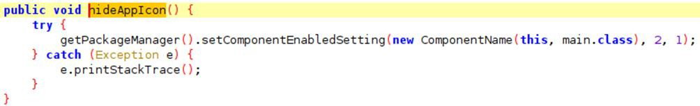 To ensure prolonged effcacy, spyware strives to remain concealed, evading detection and removal. In this pursuit, the adversary behind “IRATA” has incorporated a function that hides the app’s icon.The absence of an icon serves to obscure the app’s presence on the victim’sdevice, further prolonging its clandestine operation.